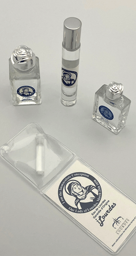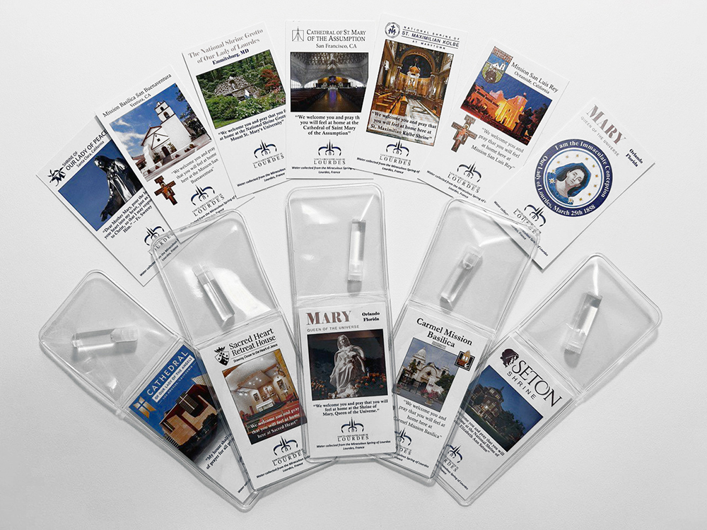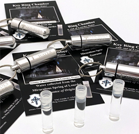 We offer a key ring chamber with a capsule of Lourdes water.